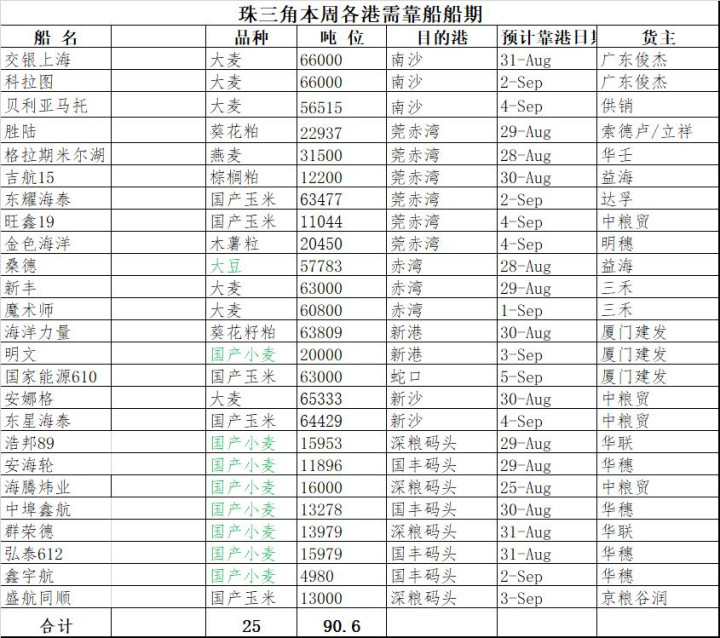 截止2025年8月29日珠三角内贸玉米到货累计975.6万:建发242.3万;达孚170.6万;供销109.4万;中粮贸89.3万;象屿70.7万;启润62.4万;中牧52.3万;京粮45.1万;国贸30.9万;托福18.4万;物产12.5万;海鑫11万;华大7.8万;佳德高7.5万吨。