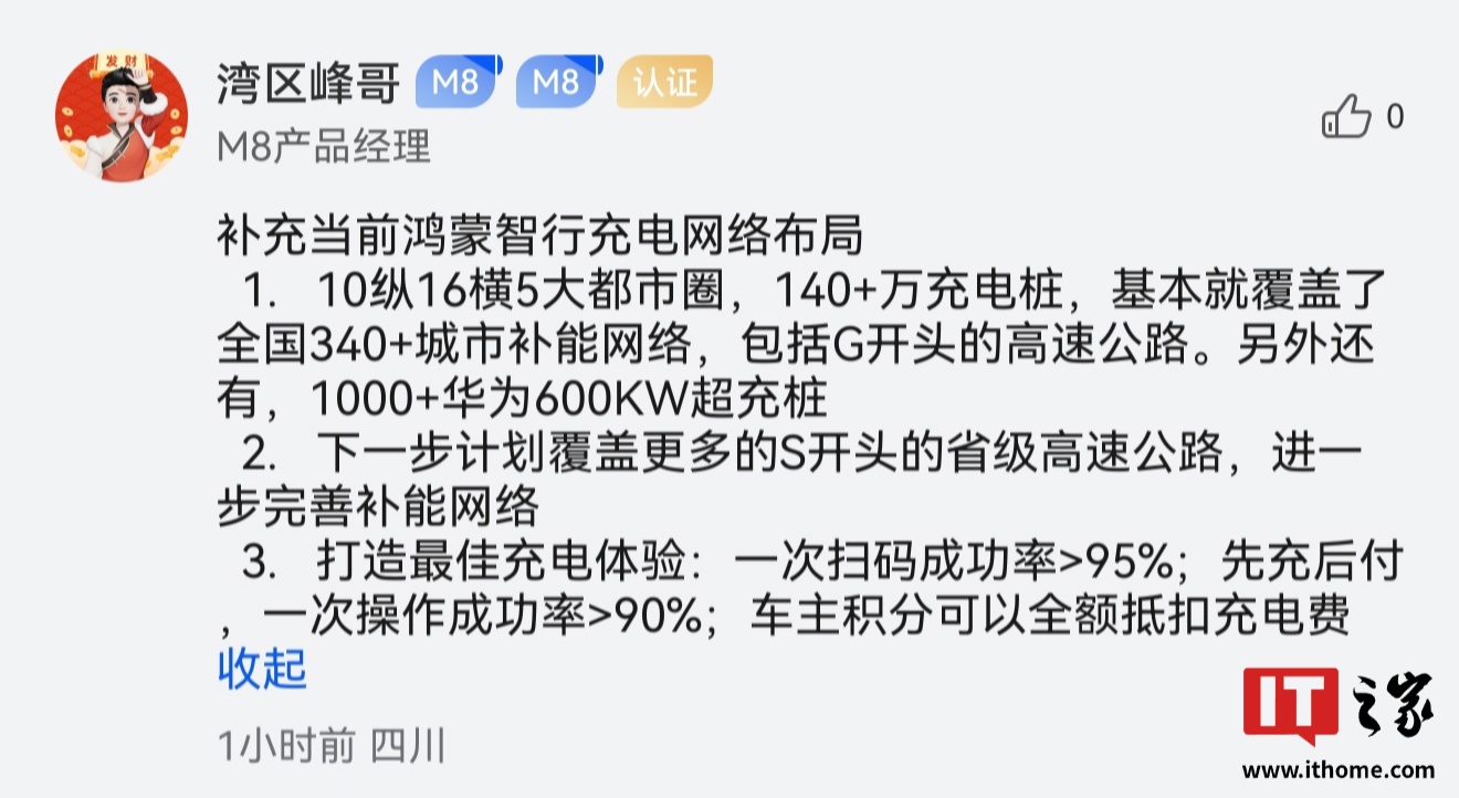IT之家 7 月 31 日消息,M8 产品经理 @湾区峰哥 今日发文介绍了充电网络布局。据介绍,鸿蒙智行充电网络覆盖 10 纵 16 横 5 大都市圈,接入 140+ 万充电桩,基本覆盖全国 340+ 城市补能网络,包括 G 开头的高速公路。