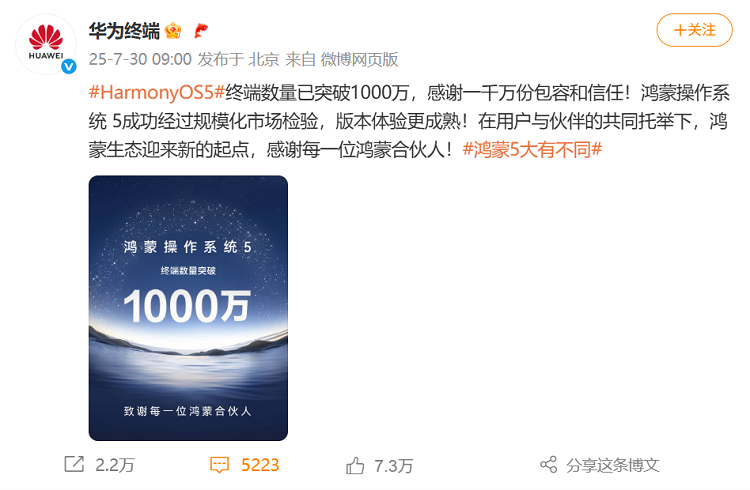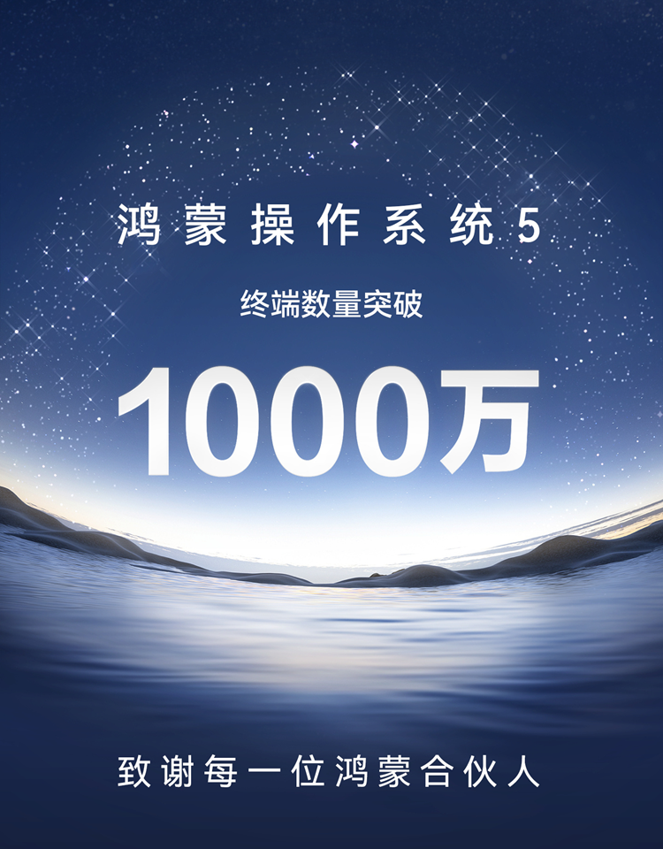 就在今天,华为终端宣布,华为鸿蒙5终端数量突破1000万,需要注意的是,鸿蒙5是不再兼容安卓的国产自主操作系统,这也意味着,鸿蒙5已经经历过市场的考验,开始有条不紊被市场认可。
