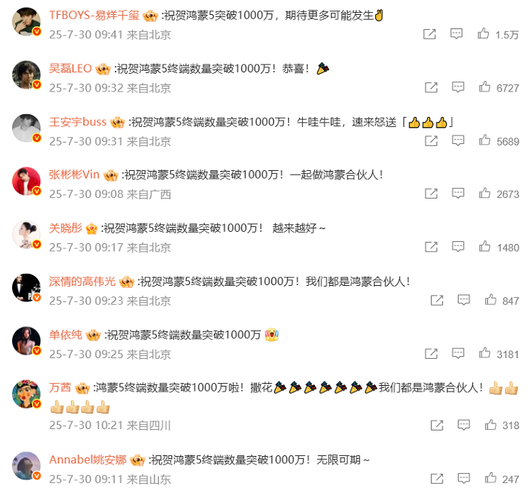 有意思的是,华为的这条博文内容,获得了众多明星发文祝贺,其中不乏正当红的明星顶流。比如与华为合作代言的易烊千玺、关晓彤,还有吴磊、王安宇、张彬彬、高伟光、单依纯、万茜、常华森、陆毅等等,还有华为自家的“二公主”姚安娜。